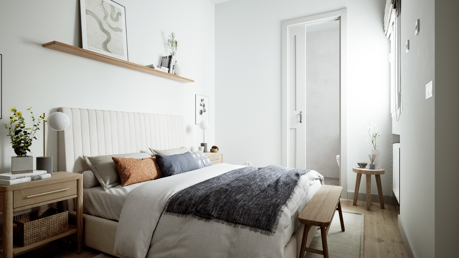 Se distribuye en un gran salón con dos ventanales a la calle principal y cocina integrada. Tres dormitorios principales, dos de ellos con vestidor y cuarto de baño completo en suite. Y un aseo de cortesía.